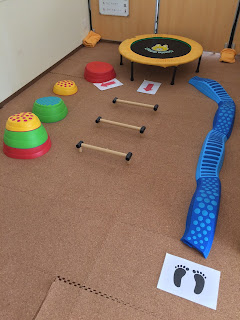 写真のサーキットは、ウエイブバランス平均台から始まり、トランポリンでジャンプして、そこから2つのコースがあり、1つは飛び石、もう1つはハードルというコースにしてあります。