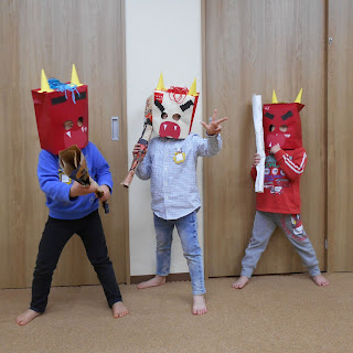 先日のグループ療育では、みんなで鬼の被り物を作りました。