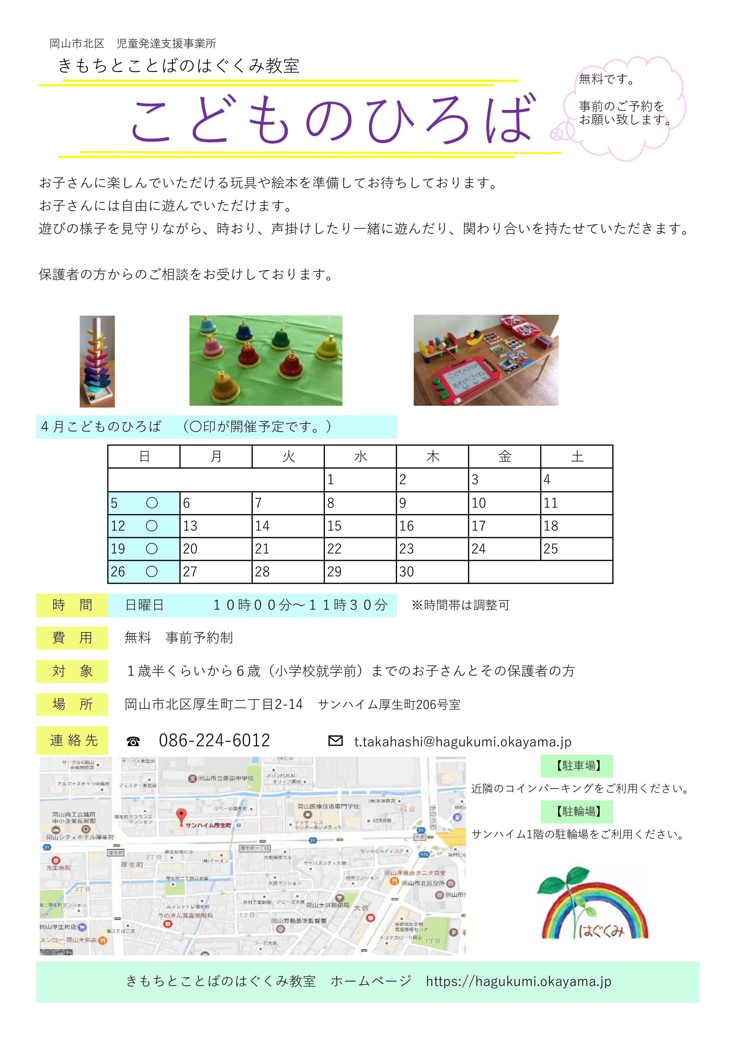 『こどものひろば』を、毎週日曜日の10:00~11:30に開催させていただきます。