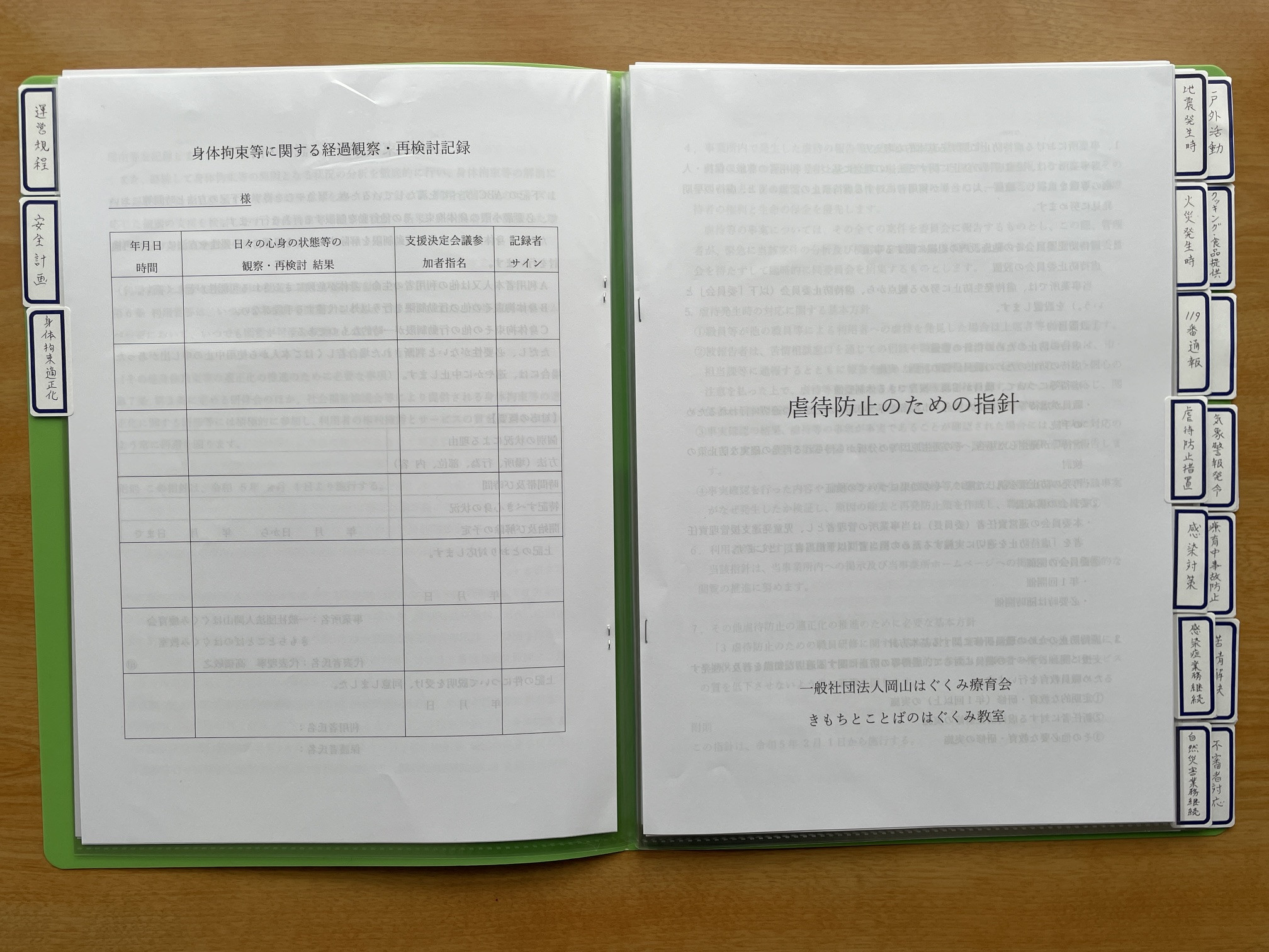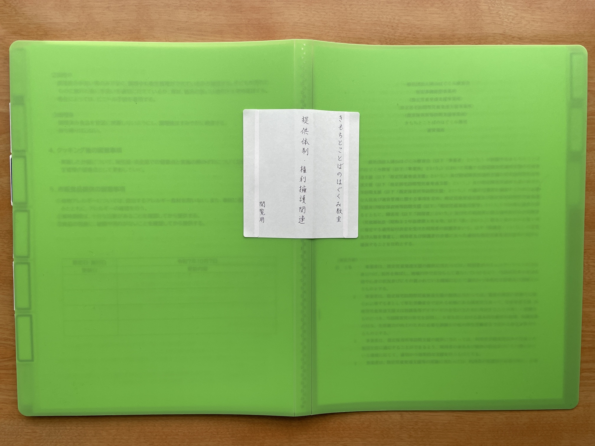 児童発達支援ガイドラインに基づく、提供体制・権利擁護に係る規程・計画・指針・マニュアル等一式につきまして、利用者様向けの閲覧用および貸し出し用のファイルを一部ずつ作成し、待合室に設置させていただきました。