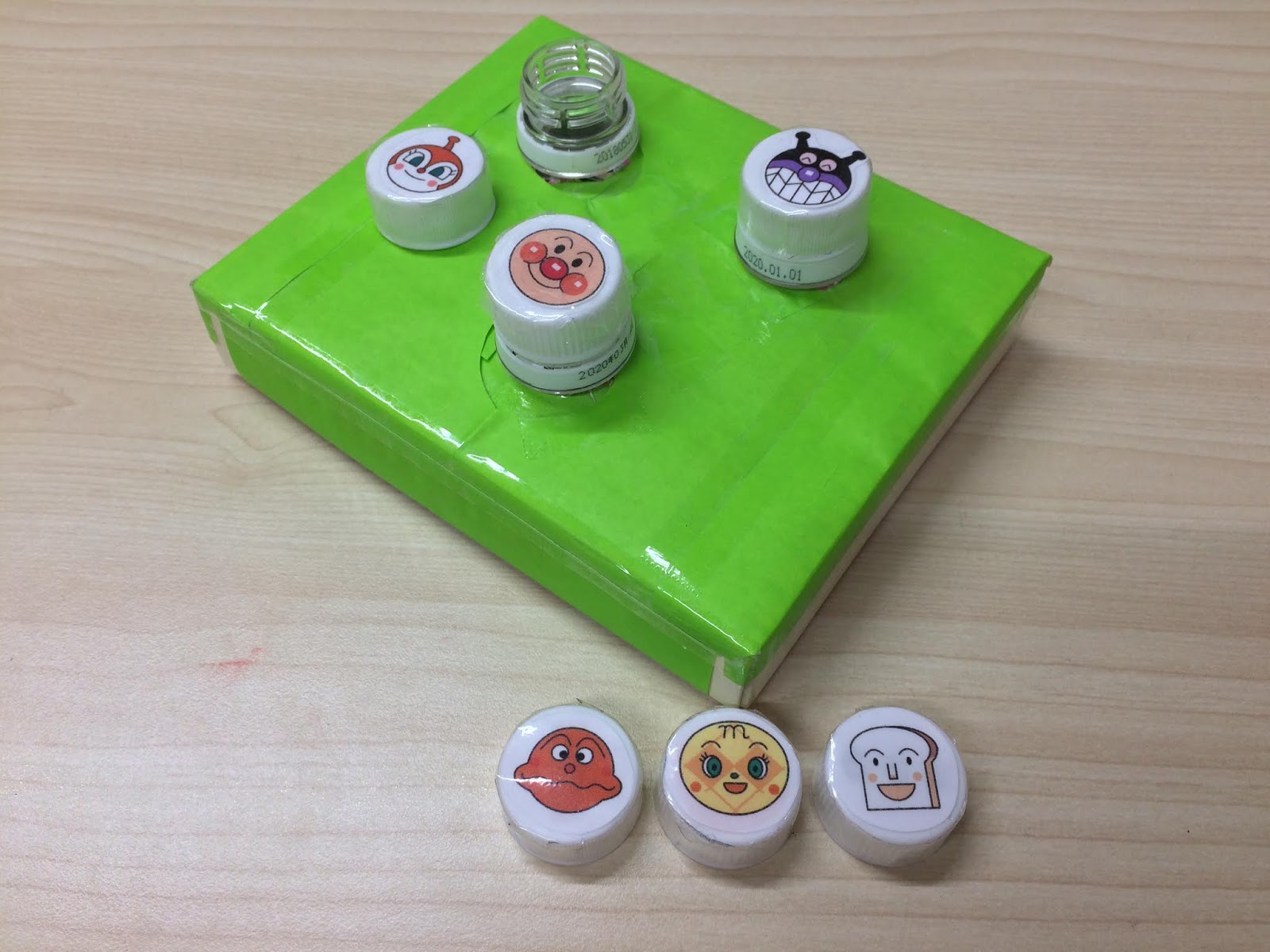 ペットボトルのふたには、子どもたちが興味を持ってくれるように、アンパンマンのキャラクターの絵を貼っています。