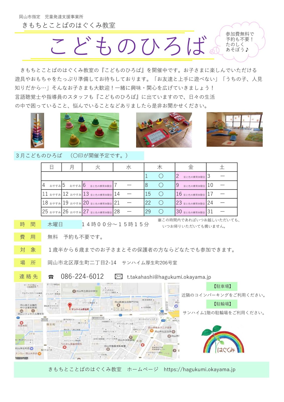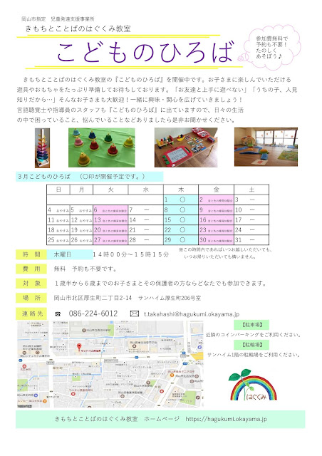 「こどものひろば」につきまして、今月3月から、毎週木曜日の14:00~15:15の開催とさせていただいております。